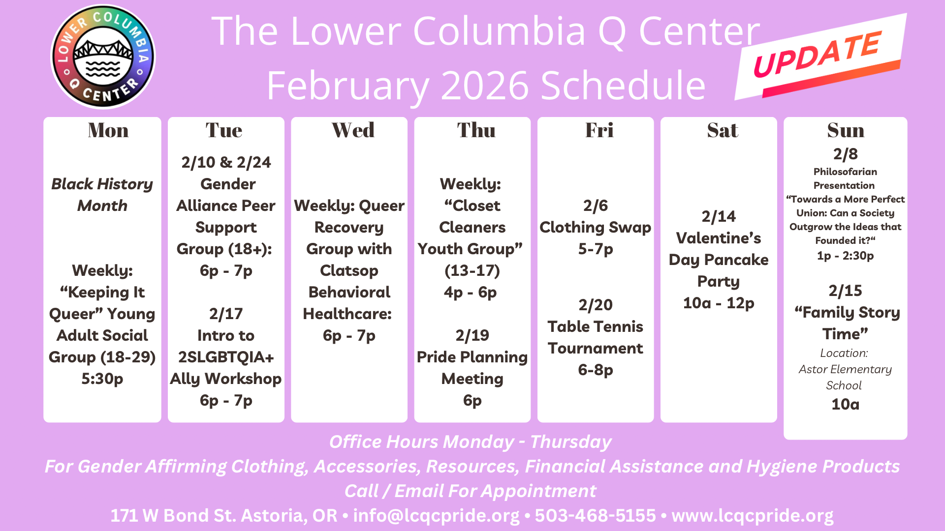 The LCQC is a 501(c)(3) non-profit resource Center providing outreach, education, and charity for the 2SLGBTQIA+ Community and allies of the Lower Columbia Region of Oregon and Washington. EIN: 81-1952670