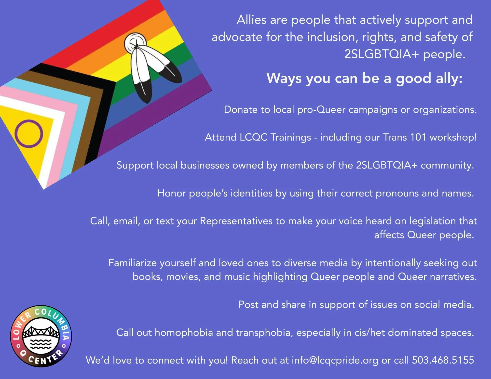 2S: Two Spirit. Indigenous term for gender and/or orientation that’s outside of Western definitions. For use by Indigenous people only. *Not all Indigenous queer people identify as Two-Spirit. By placing the 2S first in the acronym, the LCQC acknowledges and honors the Indigenous roots of the term, and to emphasize the importance of Indigenous perspectives and identities within the broader 2SLGBTQIA+ community. Placing "2S" first recognizes the historical and ongoing contributions of Indigenous people to discussions about gender and sexual diversity, and highlights the need for visibility and inclusion of Two-Spirit identities in these conversations.